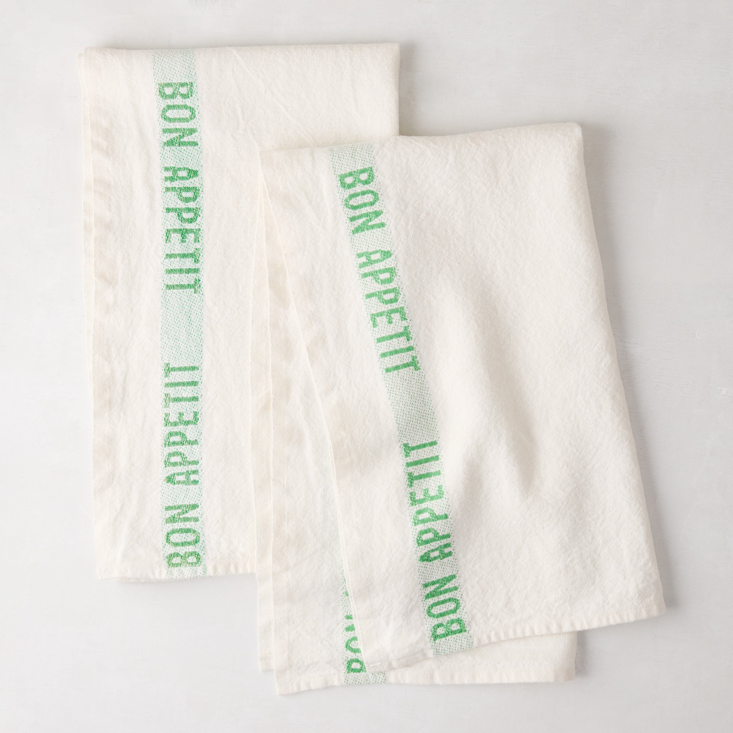 Bright Green "Bon Appetit" Linen Hand Towels, Set of 2