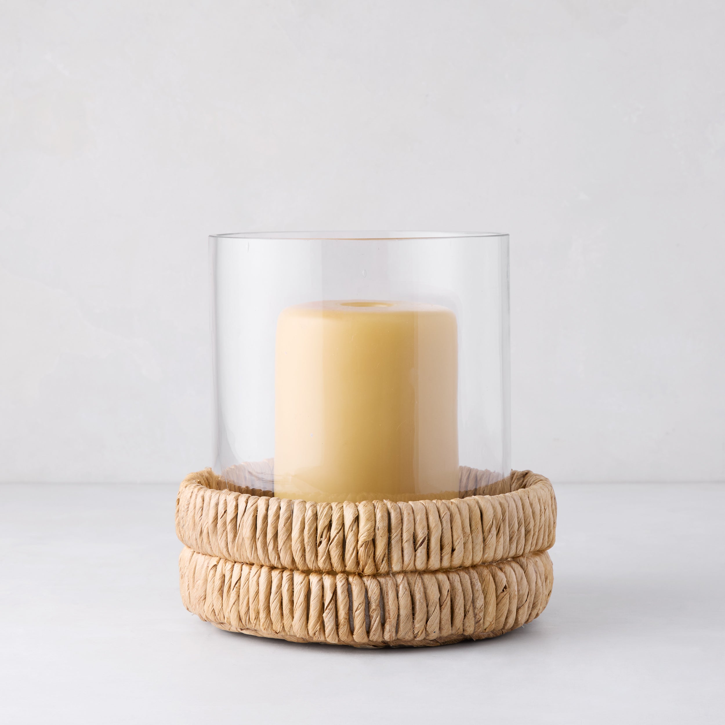 Enhance your space with the coastal charm of the Hudson Grace Medium Glass Hurricane, featuring a handwoven banana bark base. The hurricane’s open, airy design was designed to hold an HG Amber Candle, creating a warm and inviting ambient glow.