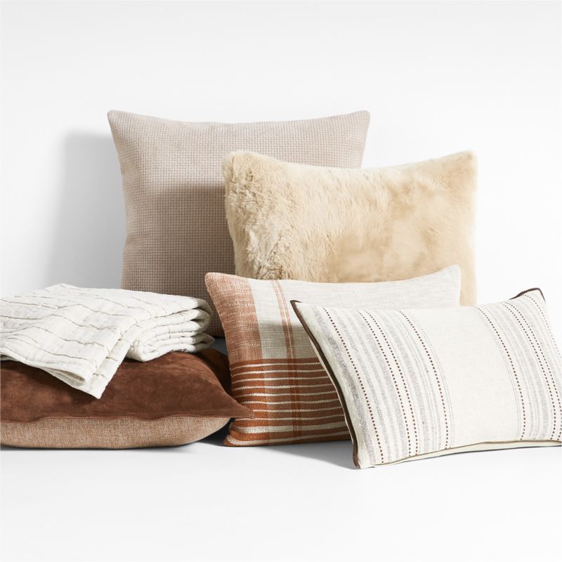 Strips of creamy taupe suede intersect in our richly textured basketweave pillow cover. The pressed, braided cover reimagines a tweedy weave in naturally luxurious suede. Finely woven Jackson is equally at-home on elegantly upholstered furniture and rustic leather pieces. For maximum comfort, fill our exclusive square throw pillow cover with a plush feather or lofty down-alternative insert sold separately.