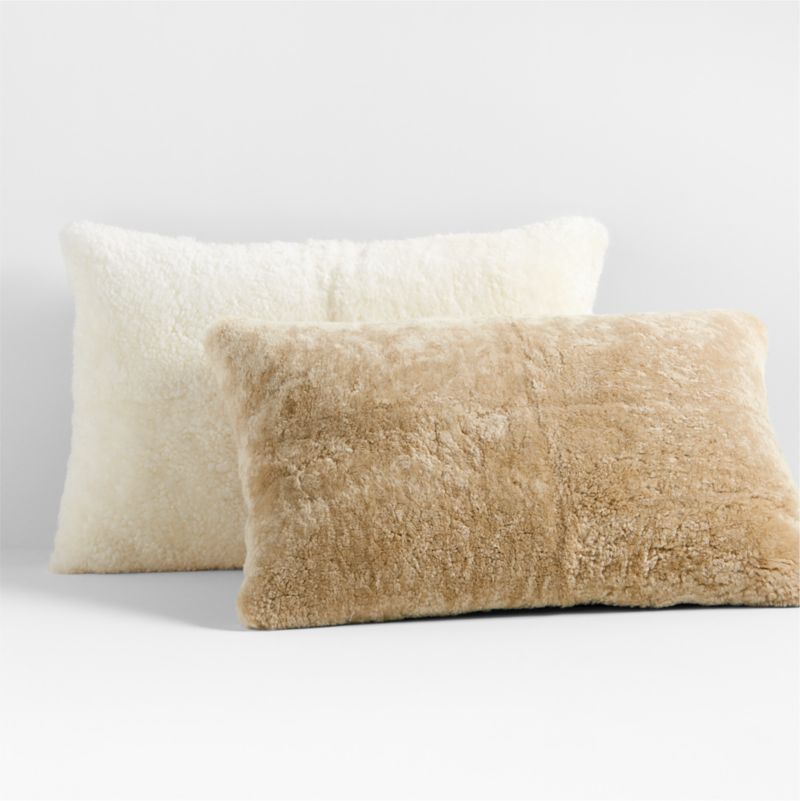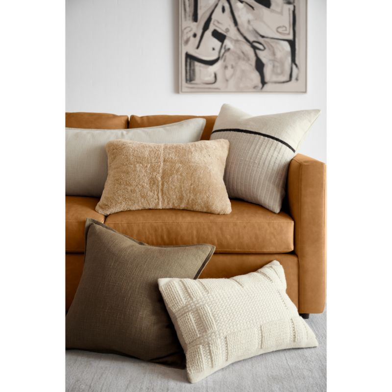 Totally luxe and irresistible to the touch, this camel brown pillow indulges in pure sheepskin. The cuddly shearling in a toasty hue layers softness and extravagance onto your sofa, armchair or bed-we especially love Malmo on a bed made up entirely in warm shades of brown. Backed in linen, our exclusive lumbar throw pillow includes your choice of a plush feather or lofty down-alternative insert.
