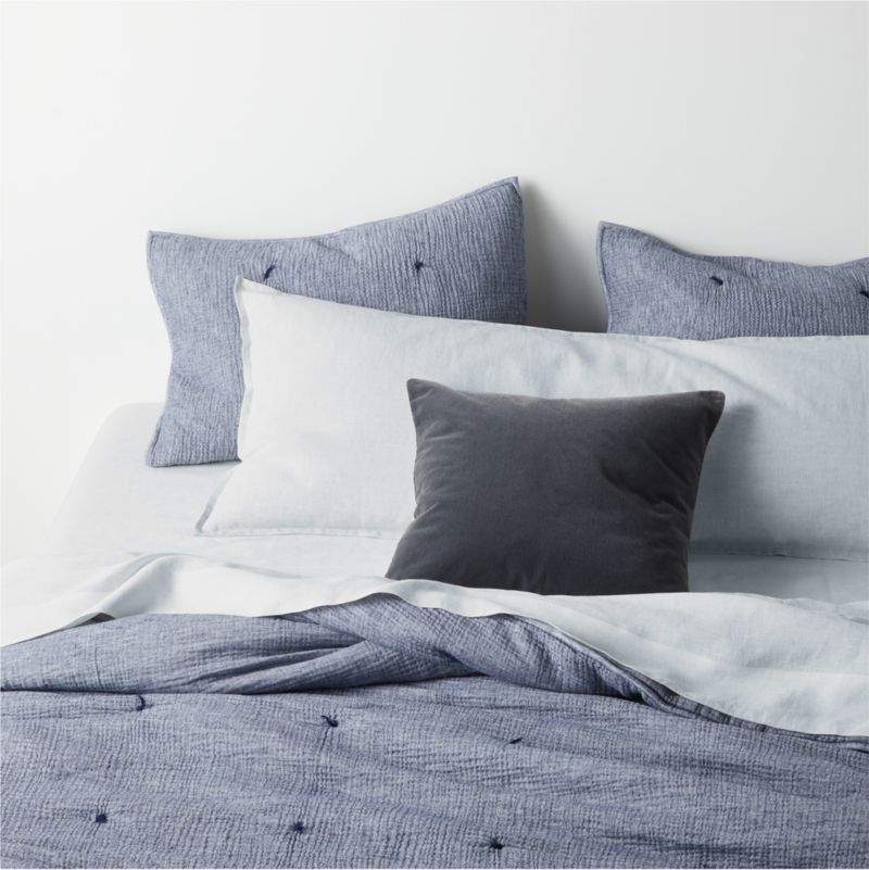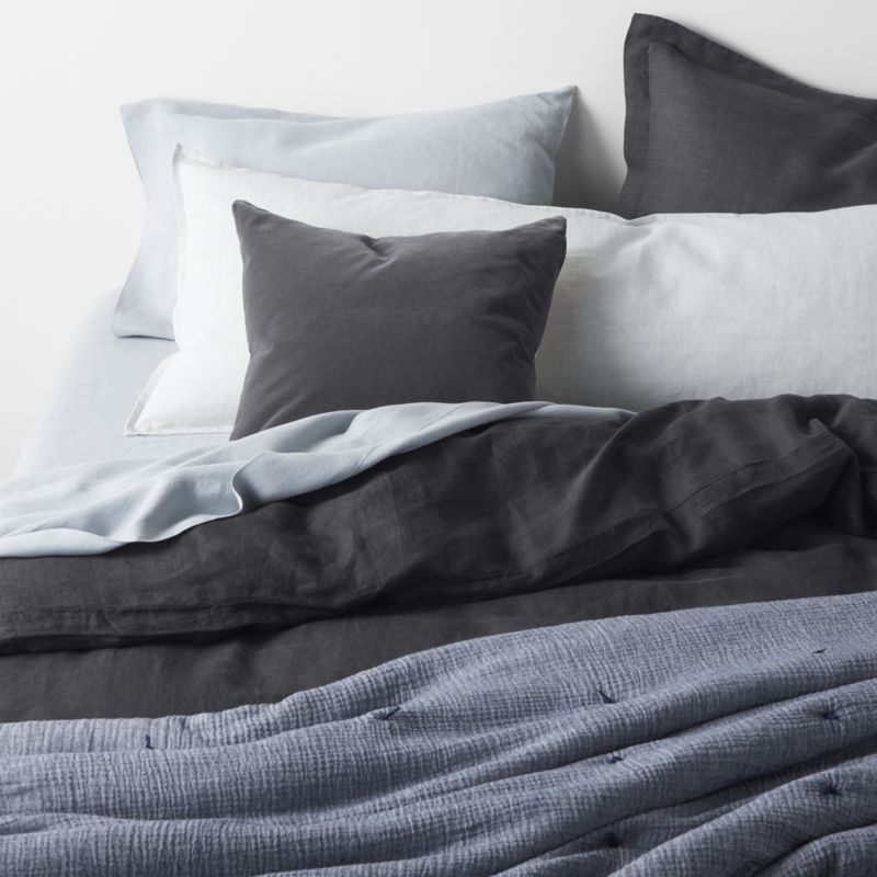 Pure Belgian flax linen weaves a classic body pillow cover in pale, serene blue. Tailored with generous flange edges, the flax linen cover has a modern organic appeal, a beautiful touch and subtle, sophisticated coloration. The pillow cover mixes and matches with our exclusive mist blue bedding to make a modern bed. Our exclusive throw pillow includes a plush feather insert.