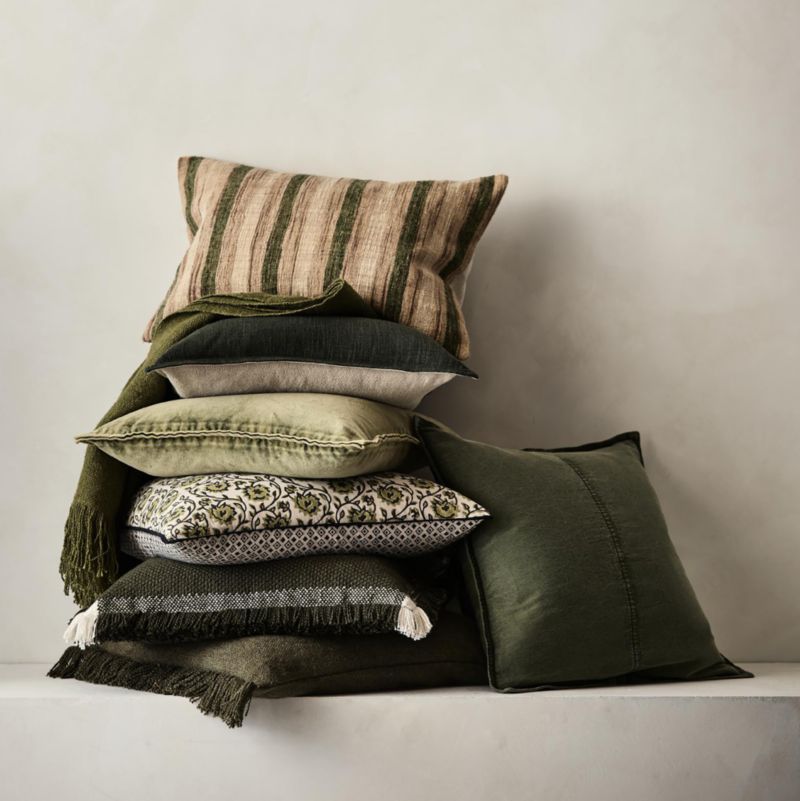 Elevated yet low-key, refined but relaxed. Our exclusive pillow cover collection reimagines velvet for everyday luxury-casual, comfortable and chic. The washed finish has a modern matte look, while the dyeing process creates subtle variations in the solid mossy green hue. Softly finished with flange tailoring, the organic cotton pillow looks right year-round tossed on your sofa, armchair or bed. Our exclusive square throw pillow includes your choice of a plush feather-down or lofty down-alternative insert.