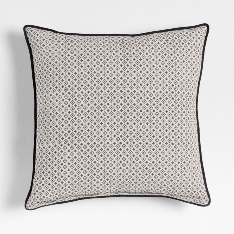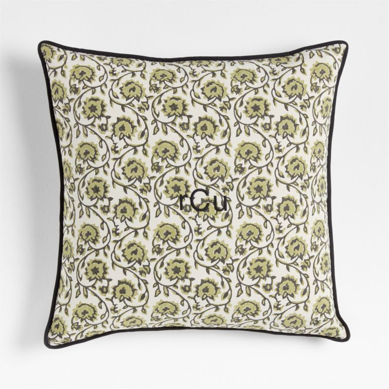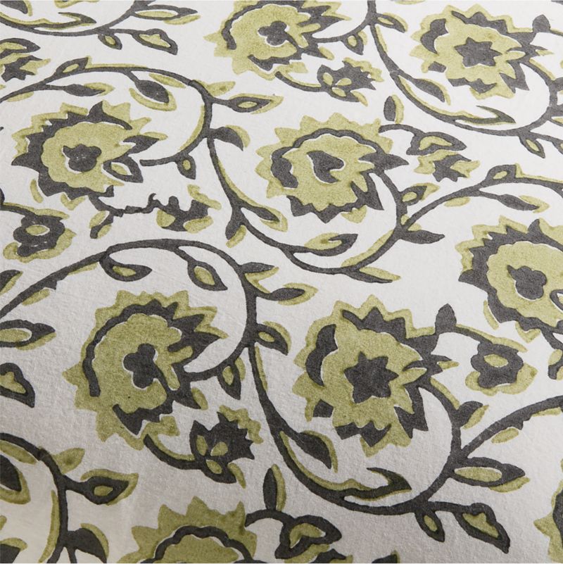 Talented artisans in rural Jaipur, India, print each of our pillows by hand, repeatedly stamping off-white cotton with a carved block to create the swirling design. Block-printed first in olive green and then dark grey, the layered florals exhibit organic variations that make each pillow beautifully unique. Grey diamonds and quatrefoils pattern the reverse side, and black piping provides a crisp outline. Our square pillow includes your choice of a plush feather-down or lofty down-alternative insert.